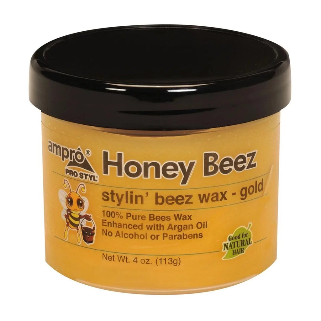 AmPro Honey Beez Wax – A premium styling wax infused with honey and beeswax 🐝. Choose between Gold (clear shine) and Black (deep, glossy finish) to define styles, tame edges, and lock in moisture.