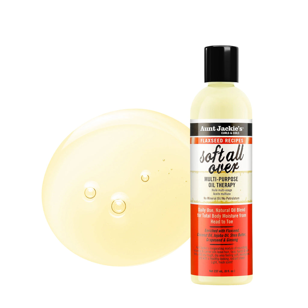 Nourish your hair, skin, and nails with Aunt Jackie's Soft All Over Multi-Purpose Oil. This versatile oil blend is enriched with natural ingredients like Shea Butter, Coconut Oil, Jojoba Oil, and Ginseng, providing deep hydration and a radiant sheen without clogging pores. Ideal for all hair types, including 1a–4c textures, it offers a lightweight, non-greasy solution for daily moisture and shine.