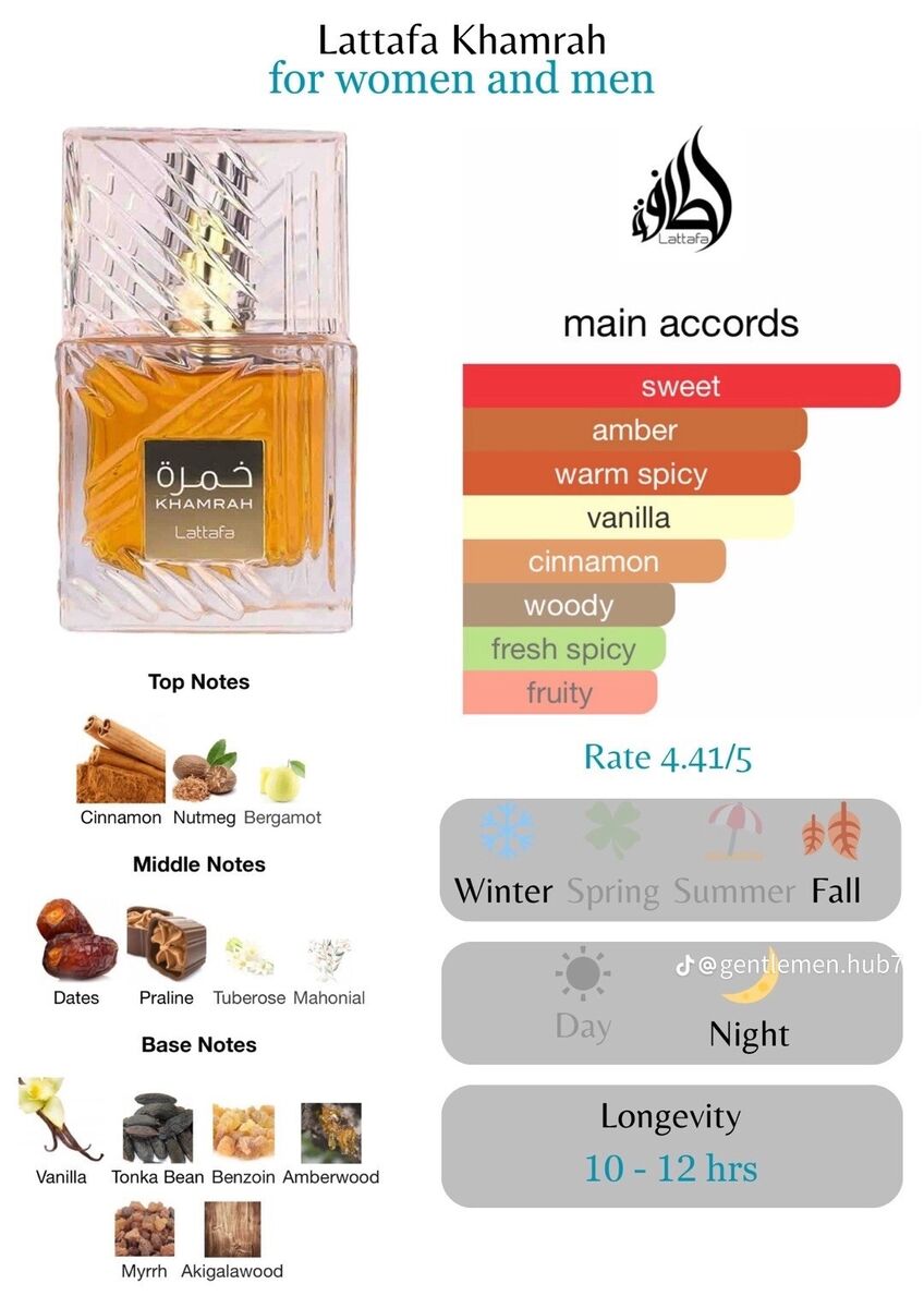 Khamrah blends warm spicy notes with vanilla, amber, and cinnamon for a luxurious scent.