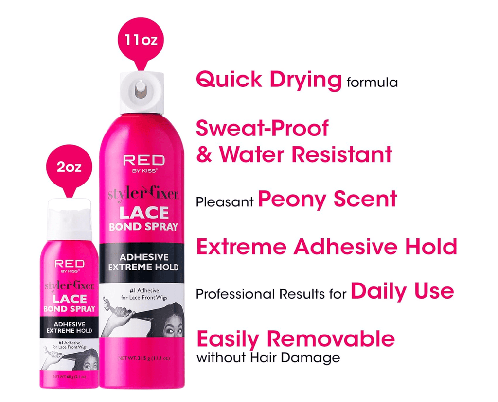 The RED by Kiss Hair Glue Spray Adhesive delivers extreme, bold hold for lace front wigs, keeping your style intact all day long. Designed for durability and precision, it acts as both a strong adhesive and a hair styling spray. This spray bonds lace front wigs securely while drying fast and leaving no white residue—just a clean, natural look.
