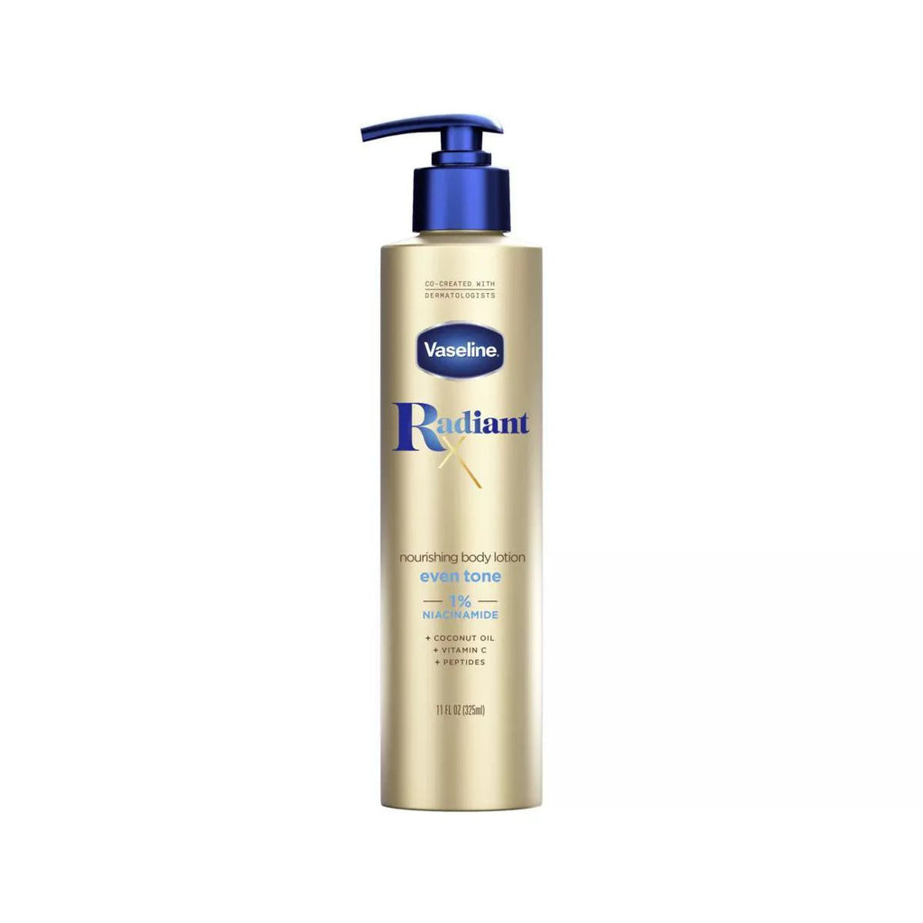 Vaseline Radiant X Even Tone Body Lotion (11 oz) is formulated with niacinamide and peptides to visibly even skin tone and restore radiance. Designed for melanin-rich skin, this dermatologist-developed lotion deeply moisturizes while helping to reduce the appearance of dark spots and discoloration.